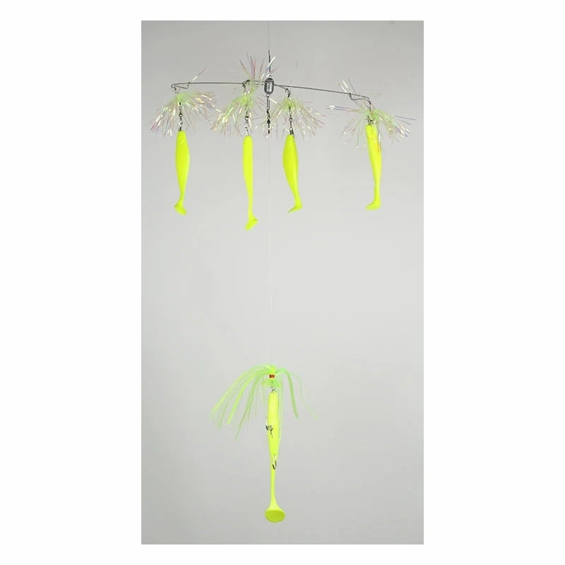 Blue Water Candy Striperbella Rigs are one of the most sought-after umbrella rigs for Striped Bass fishing up here in the North East. Whether it be the Spring or Fall run, big striped bass fall victim to this pre-made rig made with stainless steel arms and premium soft plastic shads with featherweight teasers for extra flash. Available in a variety of sizes and available in the two best selling colors – white & chartreuse.