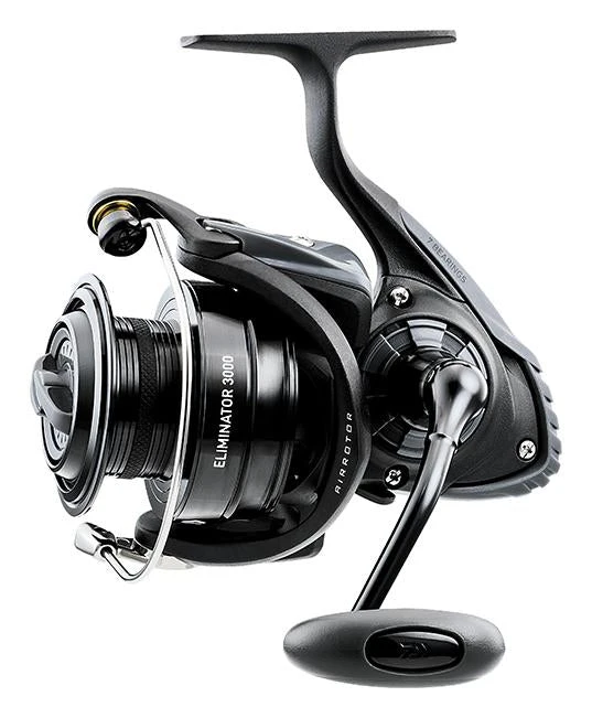 The Eliminator Series of Spinning Reels range from a compact 2500 series reel holding 6-pound test to a beefy 8000 series reel that can pack on the 30-pound test. The reels are also Well Suited For Braided Line Applications. The reel body is constructed utilizing the Hardbodyz Concept. The Aluminum Frame and Sideplate combine to form a strong rigid housing for the state of the art Digigears cut to smooth, precise standards. The attractive yet durable Anodized Finish is scratch and corrosion resistant. The Air Rotor design is 15-percent lighter yet more precisely balanced than competing reels. The stout Aluminum Spool can carry the increased pressures of braided line and houses buttery smooth, long lasting Felt Drags. Slide-in handle for easy left or right hand crank conversion. Suitable for fresh and saltwater applications. If you are looking for a high quality line of workhorse-like reels at a smart price, then you owe yourself a look at the ELIMINATOR SERIES SPINNING REELS. The Eliminator Series of Spinning Reels range from a compact 2500 series reel holding 6-pound test to a beefy 8000 series reel that can pack on the 30-pound test. The reels are also Well Suited For Braided Line Applications. The reel body is constructed utilizing the Hardbodyz Concept. The Aluminum Frame and Sideplate combine to form a strong rigid housing for the state of the art Digigears cut to smooth, precise standards. The attractive yet durable Anodized Finish is scratch and corrosion resistant. The Air Rotor design is 15-percent lighter yet more precisely balanced than competing reels. The stout Aluminum Spool can carry the increased pressures of braided line and houses buttery smooth, long lasting Felt Drags. Slide-in handle for easy left or right hand crank conversion. Suitable for fresh and saltwater applications. If you are looking for a high quality line of workhorse-like reels at a smart price, then you owe yourself a look at the ELIMINATOR SERIES SPINNING REELS.