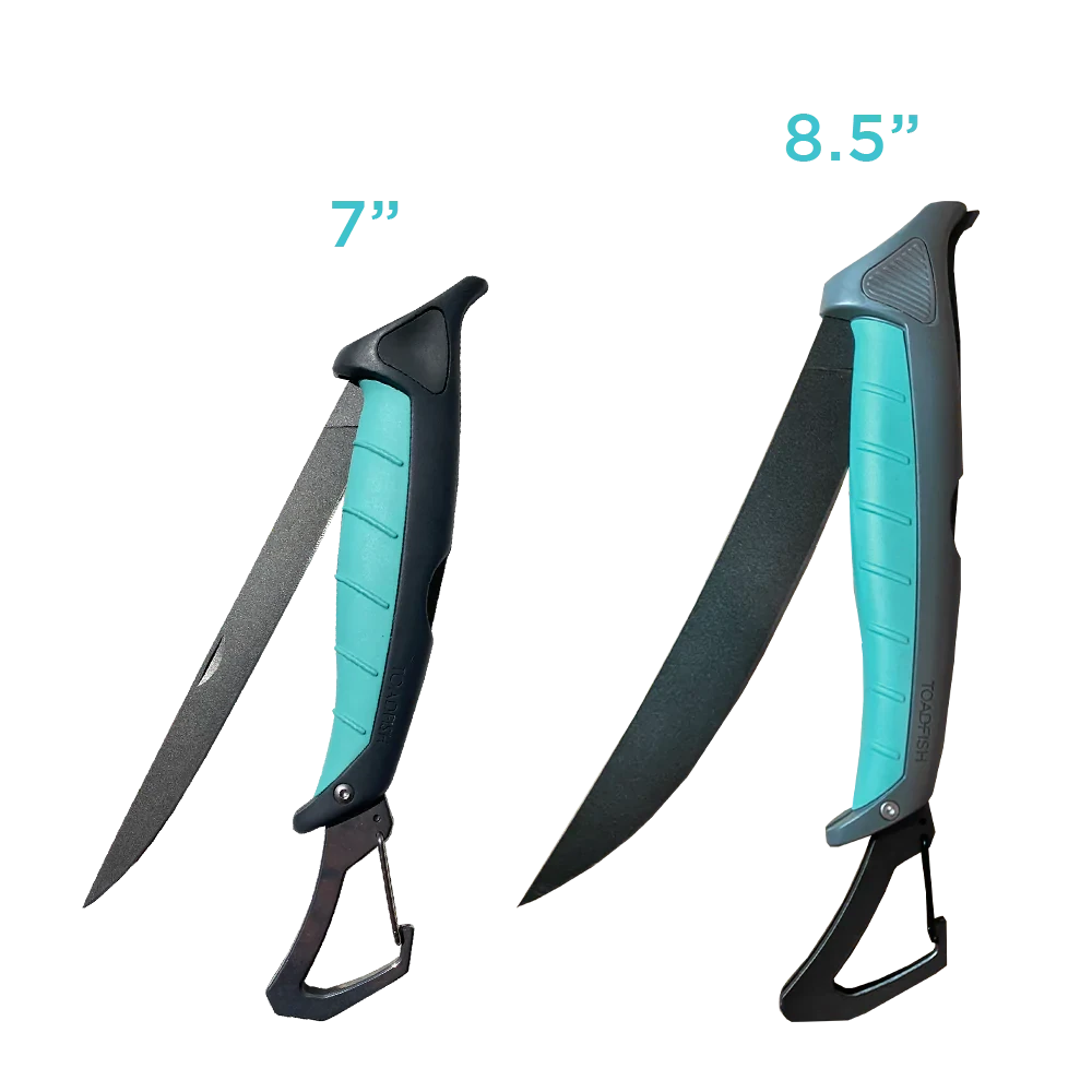 Toadfish Stowaway Folding Fillet Knives – The clever Stowaway Folding Fillet Knife combines the high-end performance and ergonomics of a full-length fixed knife with the safety and versatility of a folding knife. The Stowaway fits easily into kitchen drawers, boat boxes, tackle bags, or travel packs without the need for a bulky sheath. The Stowaway Knife features titanium coating on the high carbon stainless steel blade and all internal stainless steel components to provide superior, salt-tough corrosion resistance for harsh saltwater conditions.