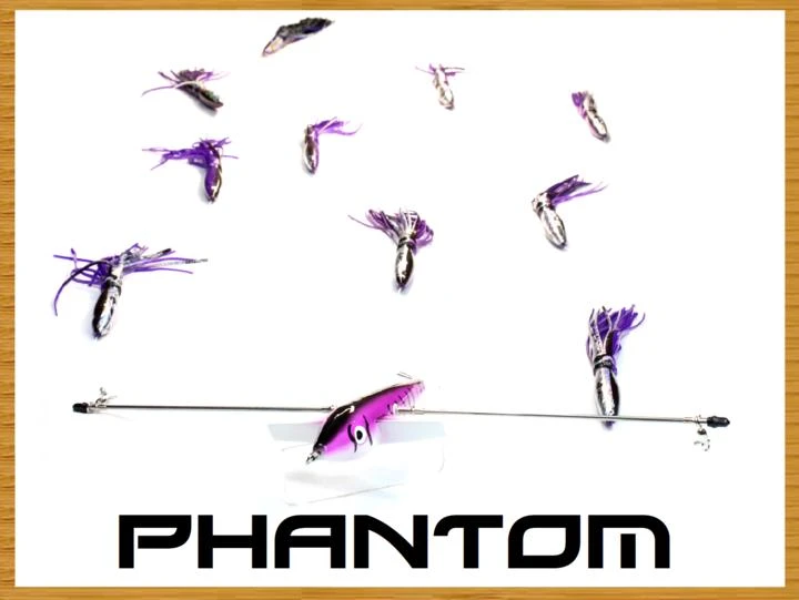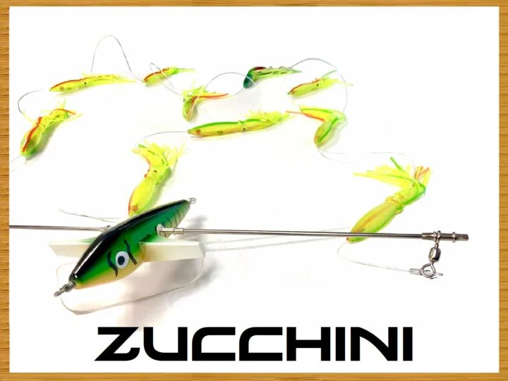 Rigged on our 7″ Looney Bird with 5mm Lexan Directional fin, a 1/8″ 316 SS bar, Nickle Plated Brass swivel Sleeves, 200lb Momoi line, 9 of our 9″ Squids, and our TMK Stinger Bait with our 7691 Stainless Steel 8/0 Hook (attached behind last teaser squid with a 200lb snap swivel).